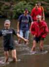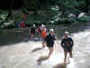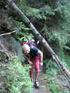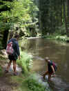War es auch am Morgen noch etwas kühl und regnerisch, so klarte es doch schnell auf und schon bald schaute die Sonne durch immer größer werdende Wolkenlöcher. Die Spitzengruppe legte ein hohes Tempo vor und so kamen wir schon bald an der Grundmühle an. Wahrscheinlich war sie inzwischen so baufällig geworden, dass man sich entschloss, wenigstens Sicherungsarbeiten durchzuführen. Warten wir mal aufs nächste Jahr, vielleicht gibt's ja dann wieder ein Ausflugslokal an dieser historischen Stelle. Durch die heftigen Regenfälle war der Wasserstand höher als sonst und auch die Strömung versetzte sogar die Wandersenioren unter uns in leichte Aufregung. Es war schon stellenweise recht anstrengend und dass es auch gefährlich war, musste in diesem Jahr ausgerechnet Christian beweisen. Beim Versuch der Stromüberquerung über einen umgestürzten Baumstamm rutschte er aus und landete rücklings im Wasser. Na gut, der Steiß wurde ja schon vorm Aufprall gekühlt, aber die Strömung riss ihn erstmal ein ganzes Stück weg. Zum Glück war Roberto zur Stelle und konnte mittels eines Stockes die Rettung einleiten (der Stock wurde später zur Reliquie erklärt, wanderte am Abend aber trotzdem aufs Lagerfeuer). Wir waren alle mit der Rettungsmaßnahme beschäftigt, so dass Keiner auf den Gedanken kam, die abenteuerliche Situation zu fotografieren. Aber mit dem Schmerz Anderer soll man ja auch keinen Profit erlangen wollen... Nach Abtrocknen und Umkleiden ging es dann doch weiter, allerdings schon mit etwas Verspätung.