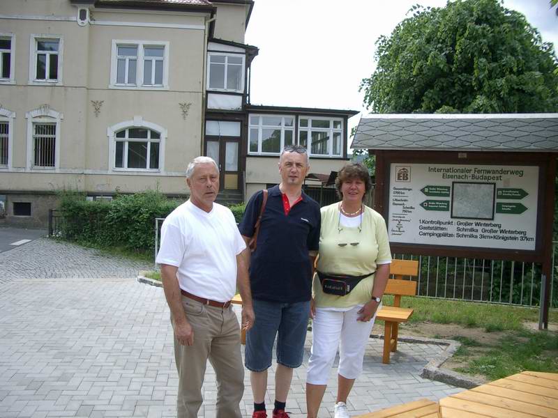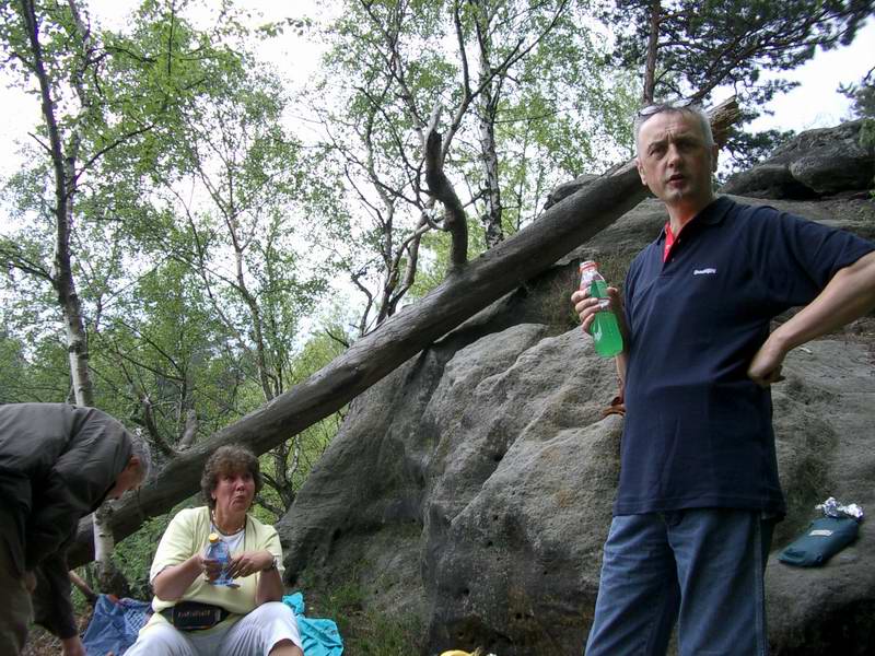 Schon lange war es geplant, das Treffen mit Volkers Schwester und Schwager, um ihnen die Sächsische Schweiz zu zeigen. Endlich konnten wir sie überreden, ein paar Tage in Dresden zu verbringen und mit uns zu wandern. Wir suchten uns eine leichte Strecke aus, die aber schon die Schönheiten des Elbsandsteingebirges zeigen sollte. Wie es ordentliche Wanderer tun, fuhren wir natürlich mit dem Zug: 9.16 Uhr ab Dresden-Pieschen bis nach Schmilka. Mit der Fähre setzten wir über und begannen unsere Tour Richtung Affensteine. Über die Rotkehlchenstiege kletterten wir bergan, auf dem Gipfel gab es dann bei einer herrlichen Aussicht bis nach Tschechien die erste, wohlverdiente Rast.