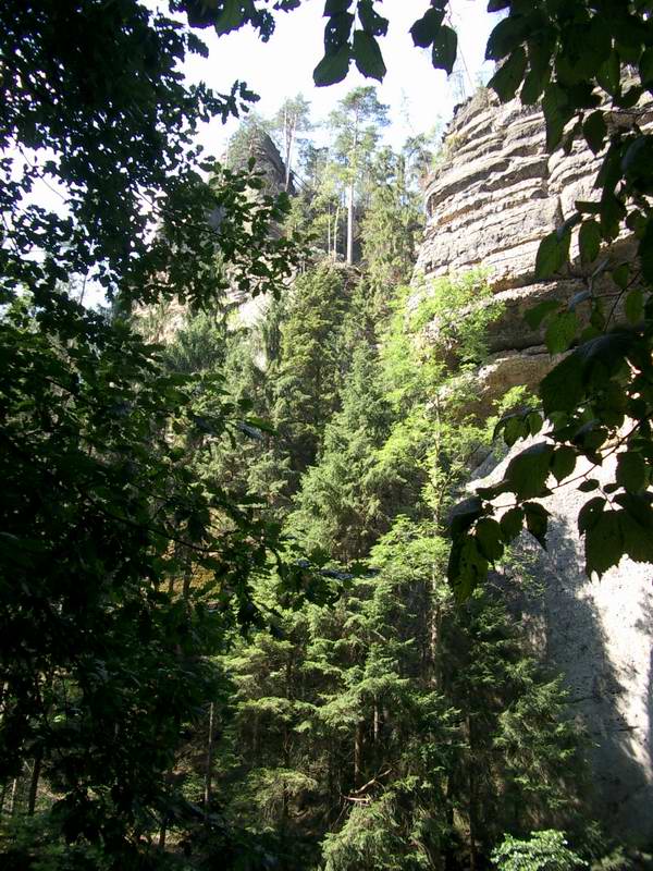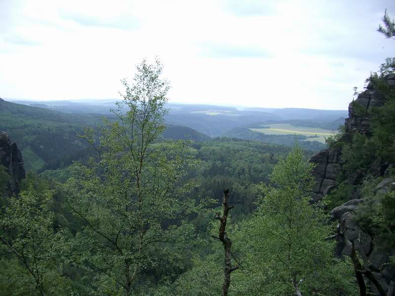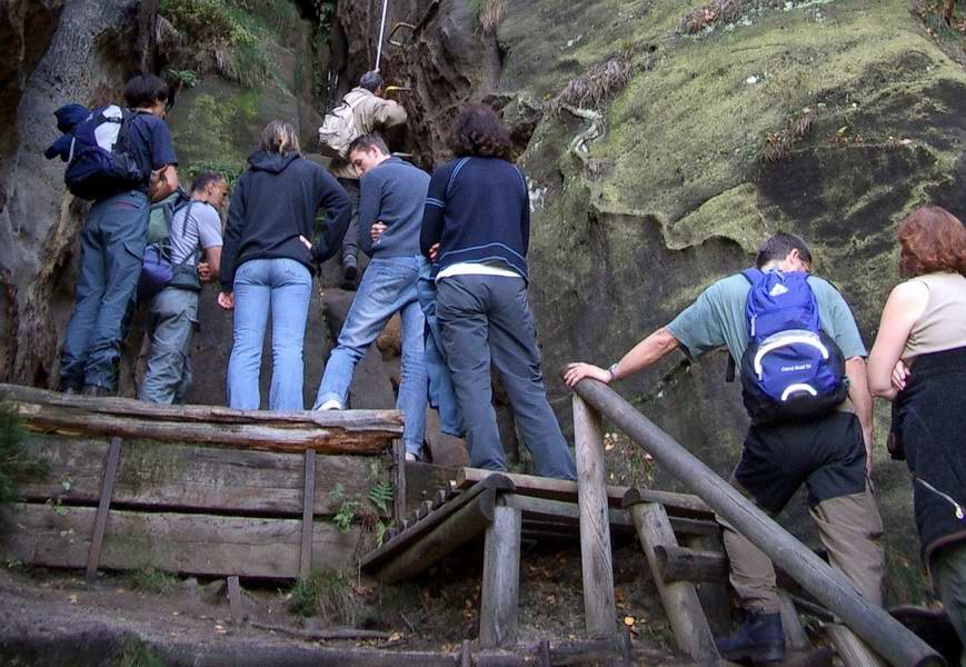 Wenn man dann aber dort oben steht, sieht die Welt ganz anders aus und nach unten zu sehen habe ich mir erst wieder gewagt, als ich wieder festen Boden unter den Füßen hatte. Nach dieser Kraxelei geht es noch eine bequeme Leiter hoch und über ein paar kleine Steine. Dann kann man schon eine herrliche Aussicht genießen. Nach Überqueren des oberen Affensteinweges beginnt der obere Teil der Häntzschelstiege. Der Einstieg befindet sich hier zehn Meter tief in einem Felsspalt, der schon durch seine Enge über das Weiterkommen entscheidet. Am Ende des Kamines geht es an Eisen vielleicht sechs Meter steil in die Höhe. Dann verlässt man den Kamin und muss sich noch ein ganzes Stück horizontal und vertikal an den Felswänden entlang hangeln. Das war nicht weniger schwierig als im unteren Teil um die Felskante zu kommen! Nicht einmal fotografieren konnte ich, weil ich einfach keine Hand frei bekam! Dafür wird man dann oben wieder mit einem herrlichen Rundblick belohnt, den die meisten Kletterer jetzt auch zur Mittagspause nutzten. Uns zog es aber weiter, denn unsere Pause war erst auf dem Carolafelsen geplant.