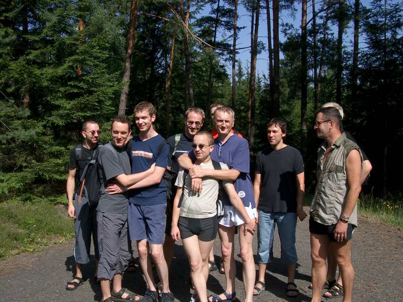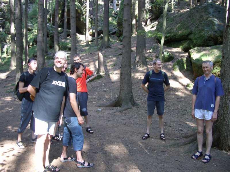 Die Rotkehlchenstiege ist wirklich zu empfehlen. Sie ist nicht zu steil und wesentlich angenehmer zu begehen als zB die Heilige Stiege mit ihren vielen Stufen. Außerdem begegnet man dort kaum Touristen. Die Rotkehlchenstiege führt vom Falkoniergrund bei Schmilka direkt hoch zum Schrammsteinweg. Und dort wollten wir ja auch hin. Nach dem Genießen der Breite-Kluft-Aussicht (die man sich ja immer mit sehr vielen Leuten teilen muss), liefen wir gleich weiter zur Schrammsteinaussicht. Auch hier: viele Leute... Jetzt begann sich auch der Himmel zu verfinstern - Kachelmann hatte es auch so angesagt. Wir mussten uns nun ziemlich beeilen und da wir bei dem beginnenden Regen nicht wieder zurück über die Felsen klettern wollten, stiegen wir über den Mittelwinkelweg zur hinteren Promenade ab. Inzwischen war der größte Guss vorbei, aber es war genug Regen, um uns alle ziemlich nass zu machen - und das trotz guter Vorbereitung und Mitnahme von Regensachen... Unterhalb vom Schrammtor fanden wir dann unter einer mächtigen Buche tatsächlich eine trockene Bank für uns ganz alleine, wo wir dann auch gleich noch ein Mal rasteten und den letzten Proviant verzehrten. Weiter ging es dann abwärts bis nach Postelwitz und dort mit der Fähre nach Krippen zum Zug. 17.30 Uhr waren wir dann wieder zu Hause in Dresden - ziemlich nass, aber immer noch bei guter Laune!