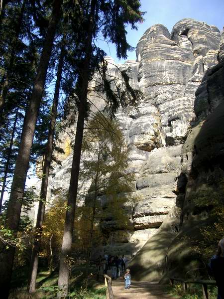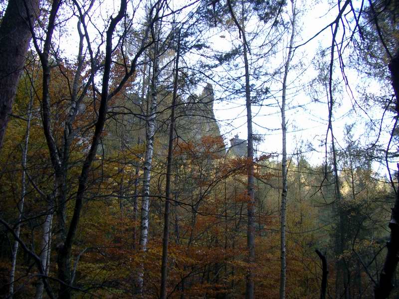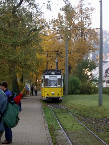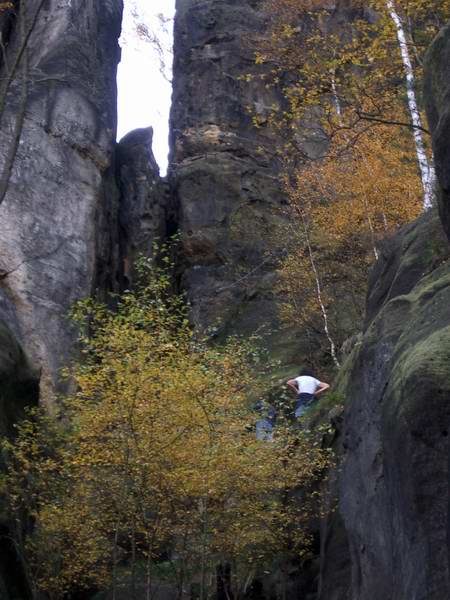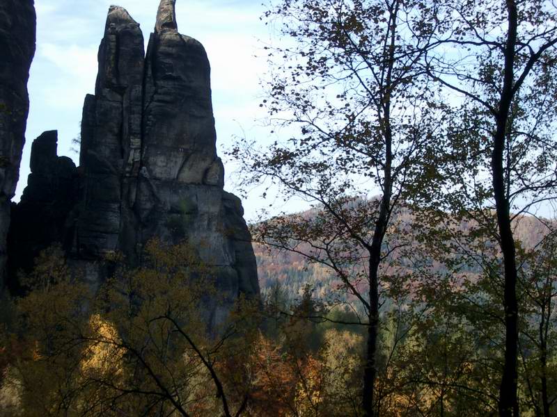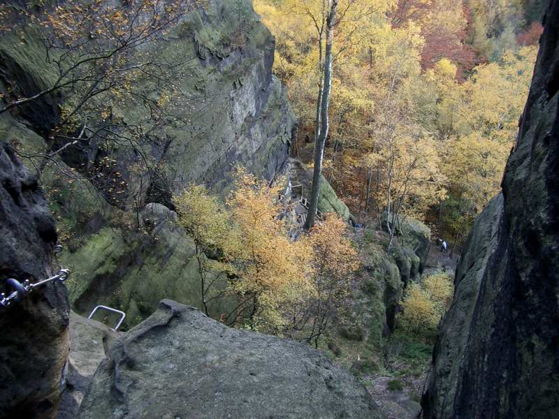 Schon seit Langem hatte ich sie im Visier: die Häntzschelstiege am Langen Horn im Affensteingebiet. Für den 24. Oktober war schönes Wetter angesagt und so sollte es wirklich noch in diesem Jahr werden. Wir fuhren wieder mit dem Zug, dieses Mal aber schon 8.46 Uhr - ziemlich zeitig. Aber man braucht halt viel Zeit, um in Bad Schandau über zu setzen und bis zur Kirnitzschtalbahn zu laufen. Und so erreichten wir auch erst die Bahn, die 10.00 Uhr abfuhr. Aber das war nicht zu spät, ich denke, wir waren noch unter den "frühen" Wanderern. Mit der Bahn fuhren wir bis zum Beuthenfall - das war die reine Nostalgie! Man hat schon völlig vergessen, wie es früher in Dresden in der Straßenbahnlinie 1 und 4 zuging! Am Beuthenfall trifft man dann wieder auf viele Touristen, die die bequeme Straße zum Kuhstall nutzen. Wir zweigten aber recht schnell von diesem breiten Weg ab und stiegen steil nach rechts oben in Richtung Bloßstock. Die herrliche Laubfärbung war schon hier beeindruckend.