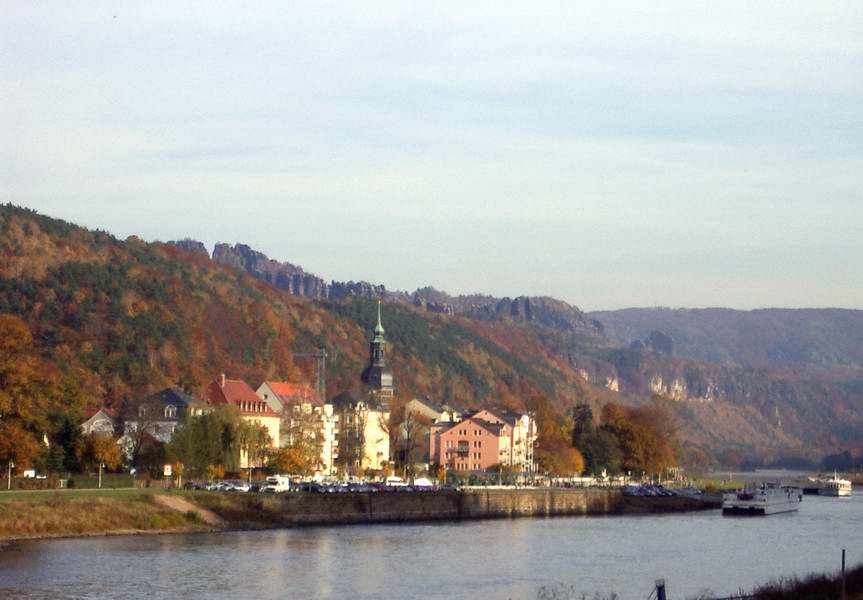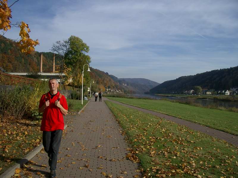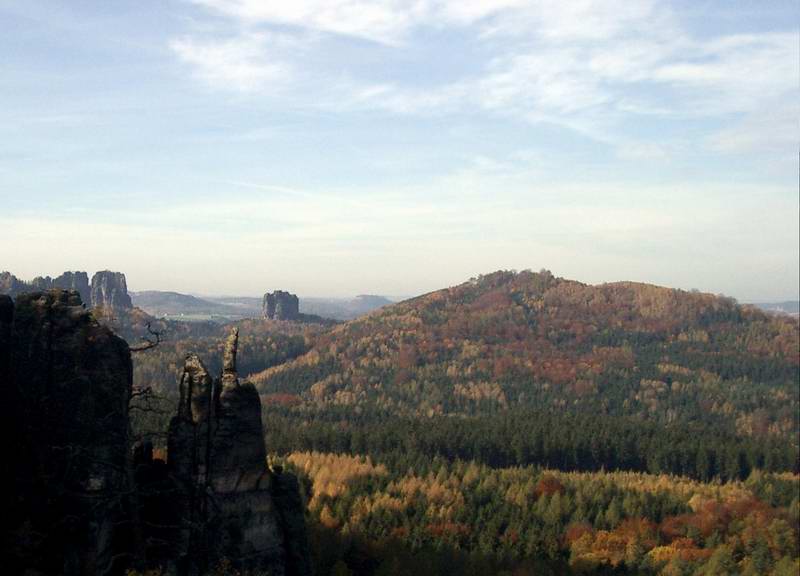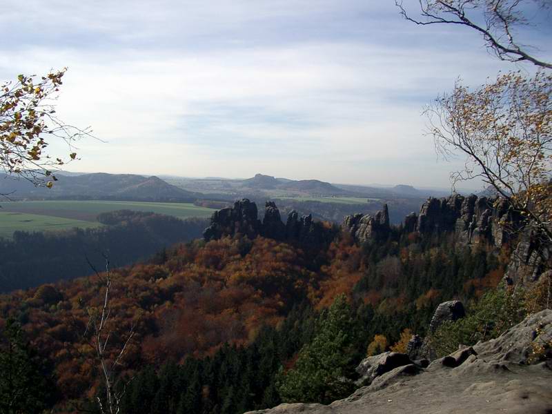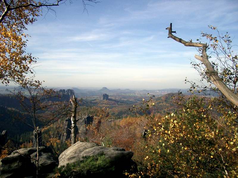Wir lagen sehr gut in der Zeit, denn trotz des Wartens am Beginn der Stiege war es jetzt erst 12.00 Uhr und genau richtig für die Mittagspause. Wir genossen auch hier auf dem Carolafelsen die herrliche Laubfärbung mit vielen anderen Wanderfreunden. Unser Weg führte uns dann wieder ein Stück bergan und wir gelangten über den Zurückesteig schließlich zum Schrammsteinweg. Die Breite-Kluft-Aussicht war auch heute wieder stark bevölkert. Schade, dass so viele Leute nicht lesen wollen und sich trotz der aufgestellten Schilder hinter der Absperrung niederlassen. Dabei sind die Erosionsschäden durch wilde Wanderwege überall sichtbar. Nun ja, wir vesperten ein Stück weiter weg und genossen die warmen Sonnenstrahlen. Über den Jägersteig und die vordere Promenade ging es dann weiter Richtung Schrammtor, von dort über den Obrigensteig hinunter nach Postelwitz. Leider fuhr wegen Bauarbeiten kein Zug von Schöna, so dass sich auch die Überfahrt nach Krippen nicht lohnte. An der Elbe entlang liefen wir also weiter bis nach Bad Schandau, wo wir, ziemlich erschöpft, unseren Schienenersatzverkehr nach Pirna erreichten. Gegen 17.00 Uhr waren wir dann wieder zu Hause - erschöpft und glücklich!